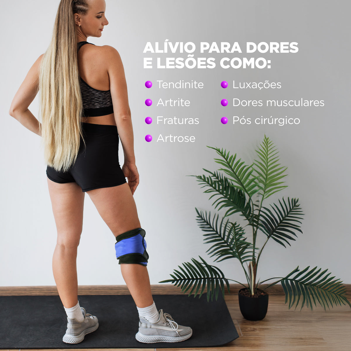 A alça regulável com acabamento em velcro facilita o ajuste, oferecendo um encaixe preciso e confortável ao redor do joelho, cobrindo 360° da área tratada, o que proporciona uma recuperação mais eficiente e homogênea.