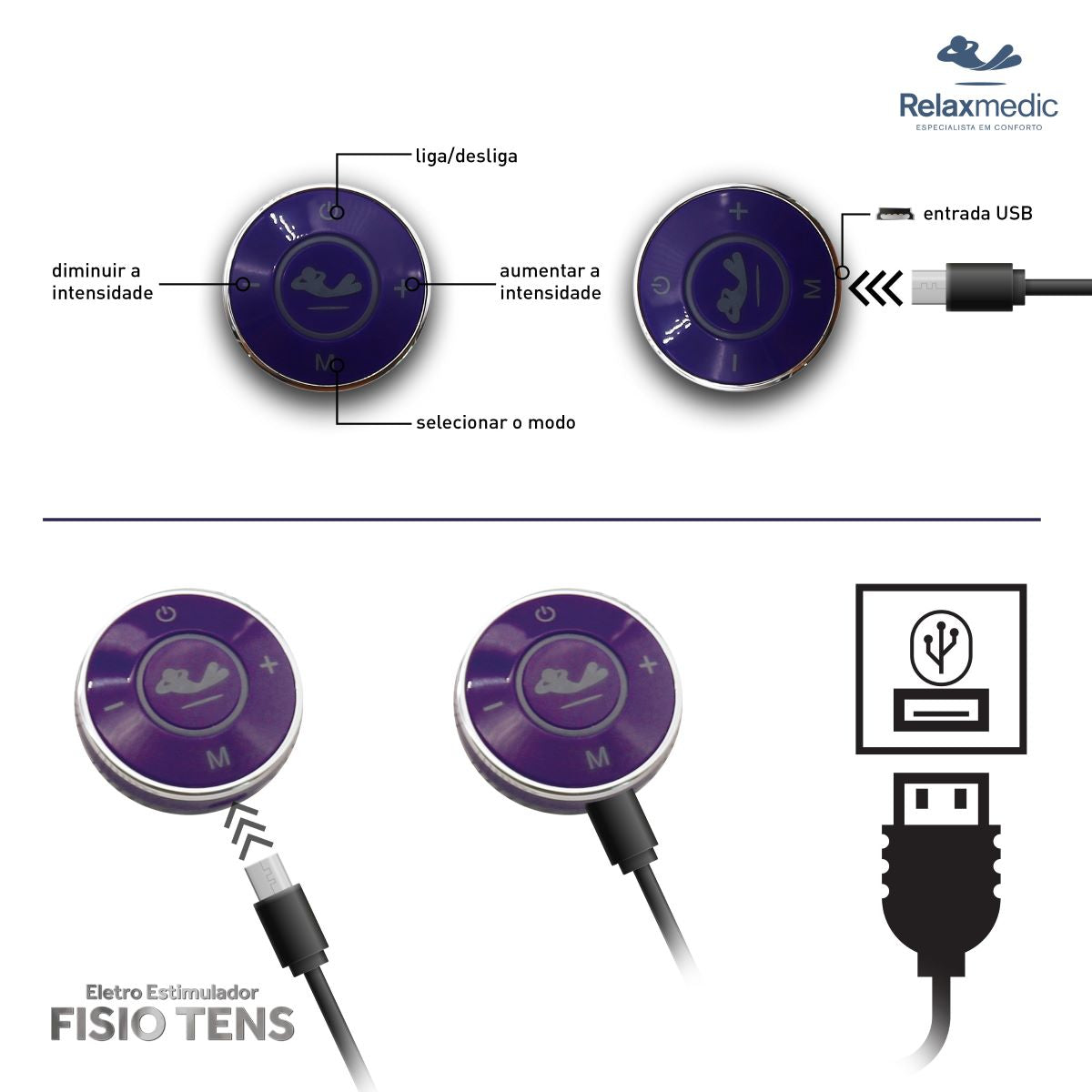 - Acompanha: Eletroestimulador Fisio Tens, 1 Pad de gel, manual de instruções, cartão de colagem para pad e cabo USB.